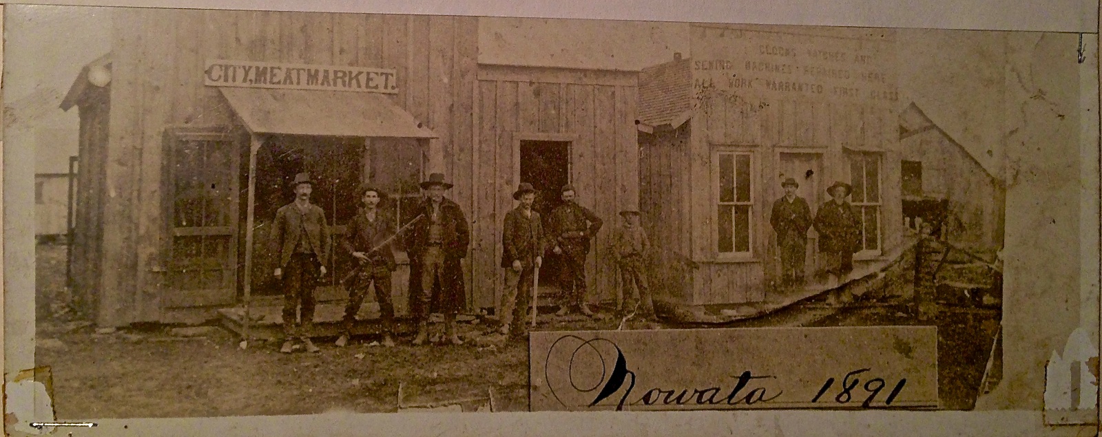 In the photo, from left to right: W.R. Moreland, Jim McGurl, Fayette Walker, Jefferson Walker, Mr. Chinn, Charles Dodge, Mr. Craft, and Will Atkinson. The two stores were in the 100 block of East Cherokee Ave. This photo was taken November 12th, 1891. The Shootout occurred in front of the Exchange Restaurant, 100 block of East Delaware Ave. in 1895. (Click the image for a larger view)