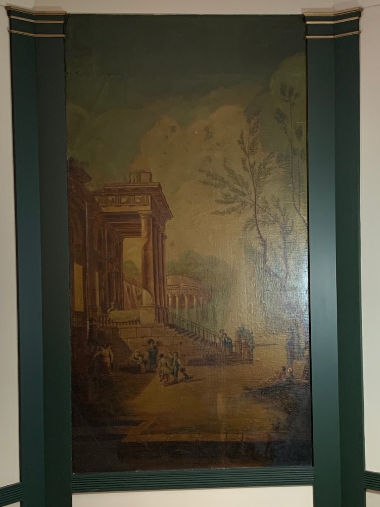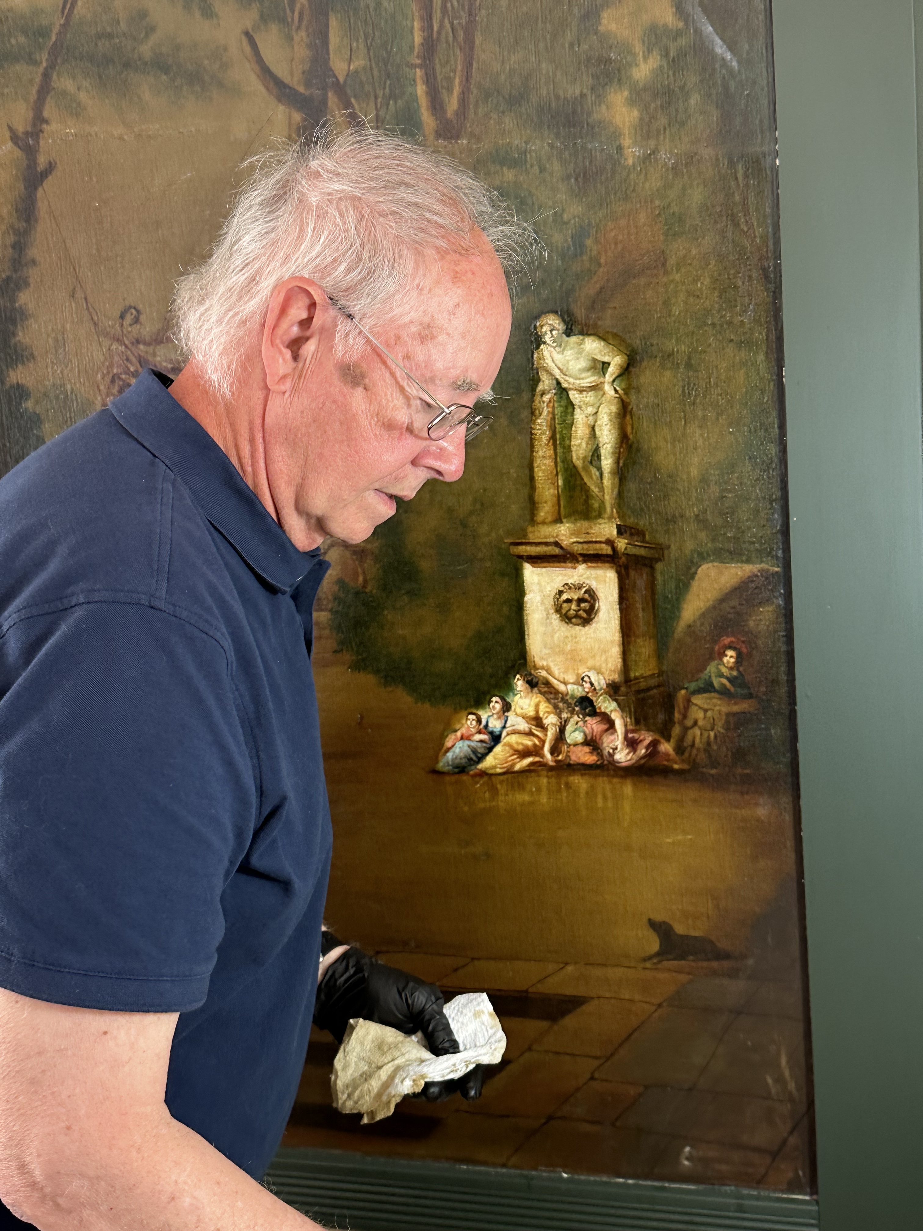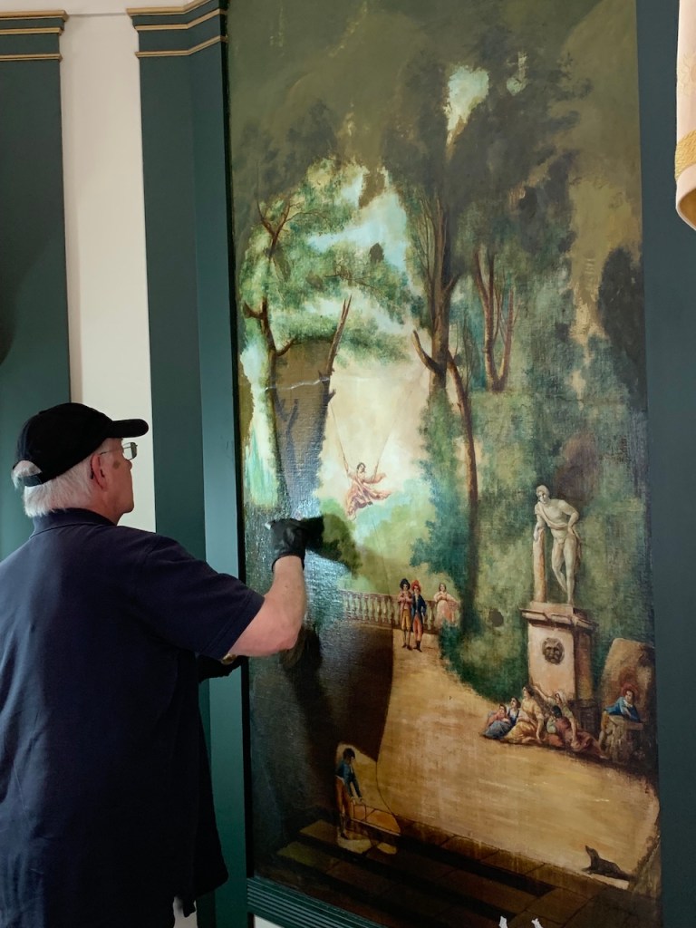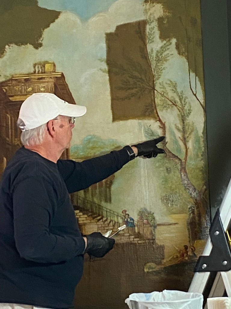 Noted conservation specialist Rick Parker has begun the work of restoring two oil paintings in the Glass Mansion. He will be removing years of particle buildup as well as old discolored varnish. It is amazing to see the vibrant colors hidden behind the fog of age. More pictures to come when the work is finished.
